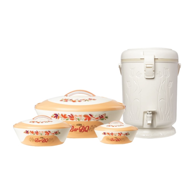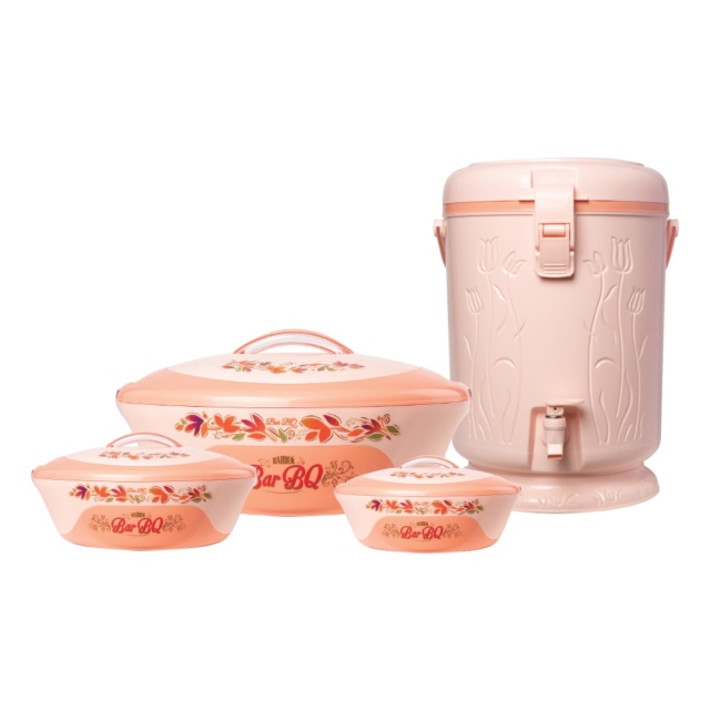 This 4 piece set of plastic crockery consists a set of three insuated Hotpots (S,M,L) with push slide lid and one insulated 14-litre wide mouth Water Cooler with easy open double side locks.