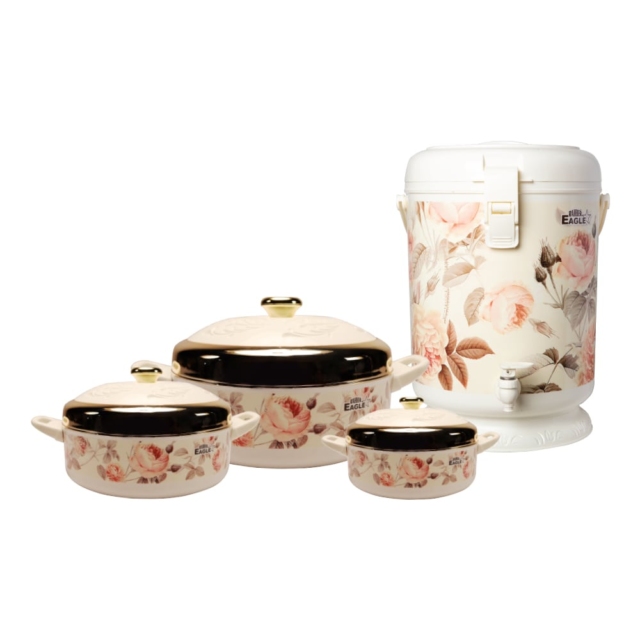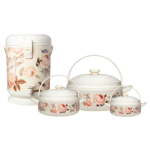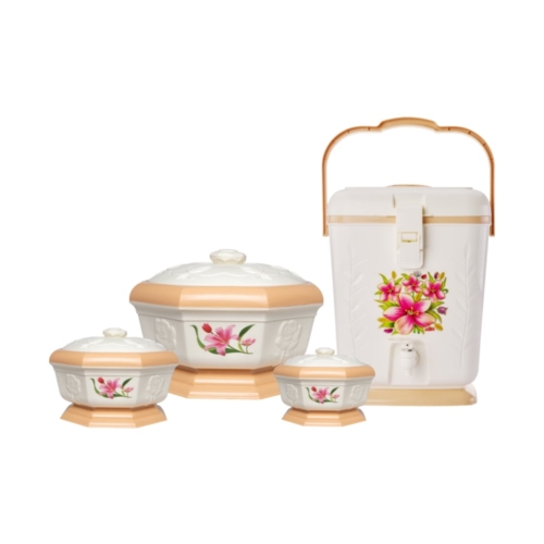 This 4 piece set of plastic crockery consists a set of three insulated Hotpots (S,M,L) with side handles and one insulated 14-litre wide mouth Water Cooler with easy open double side locks.